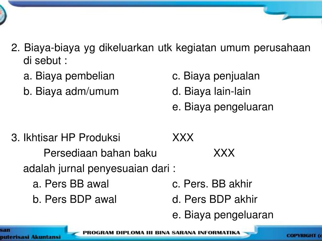 Biaya barang yang sudah diselesaikan selama suatu periode disebut harga pokok produksi barang selesai (cost of goods manufactured) atau disingkat dengan harga pokok produksi. Biaya ini terdiri dari persediaan dalam proses awal ditambah biaya pabrik. Biaya implisit merupakan pengeluaran perusahaan dalam memberikan fasilitas produksi tanpa mempengaruhi proses manufaktur secara langsung. Biasanya biaya tidak langsung ini dimasukkan dalam biaya overhead. 13.10.2011 · dari ikhtisar produksi diata sebenarnya kita sudah bisa mengambil kesimpulan bahwa proses produksi yang dilakukan telah menghabiskan biaya produksi (harga pokok produksi) sebesar rp 26.532.000. Rekening biaya tenaga kerja), dan biaya overhead pabrik (kredit: Ikhtisar biaya produksi rp 1.500.000,00. 12.08.2021 · terakhir, jenis biaya produksi adalah biaya implisit (tersembunyi). Biaya produksi adalah biaya yang dikeluarkan oleh perusahaan selama proses manufakturing atau pengelolaan dengan tujuan menghasilkan produk yang siap dipasarkan. Harga pokok produksi terdiri dari biaya produksi ditambah persediaan barang dalam proses awal dikurangi persediaan barang dalam proses akhir periode. Contoh biaya produksi eksplisit yaitu perawatan mesin, pelatihan sdm, biaya … Prestasi perusahaan antara lain dapat diukur dengan besarnya laba yang diperoleh. 17.06.2015 · harga pokok produksi adalah biaya produksi barang yang telah diselesaikan selama suatu periode.
